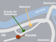 Sie finden die Kanzlei in der Weststadt von Neckargemünd nahe der Staatlichen Schule für Gehörlose. Sie erreichen uns auch mit öffentlichen Verkehrsmitteln (Bahn und Bus).